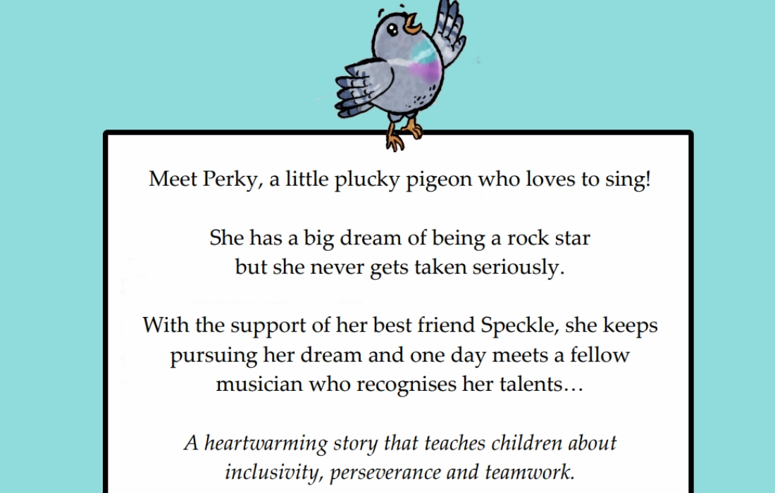 Pigeons are brilliant! Due to my two young boys' (Benni and Theo) love of pigeons, we often hang out with these feathered friends in our local park. We have got to know their different characters and their perky personalities. This inspired me to write a children's book about a plucky little pigeon called Perky. She dreams of becoming a singer for a band and despite multiple humorous knockbacks, she perseveres with heartwarming results. The book aims to teach children the importance of inclusivity as well as to dream big, keep going and never give up.